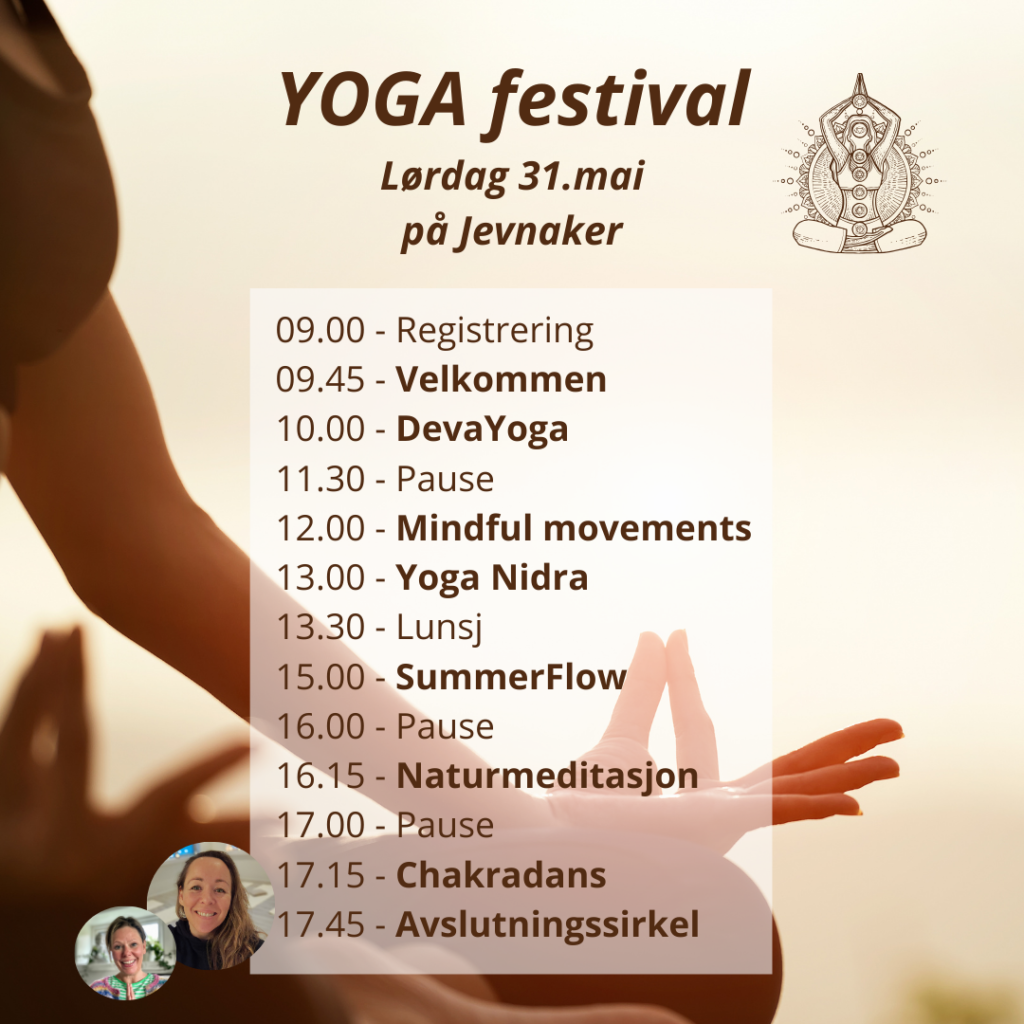 For mange av oss så trenger vi mer av yogaens og meditasjonens mangfoldige verktøy inn i våre liv som en balanse til livets belastninger. Ved å delta på vår Yoga festival vi du få erfare flere typer yoga og andre aktiviteter som er nærende for kropp, sinn og sjel.
